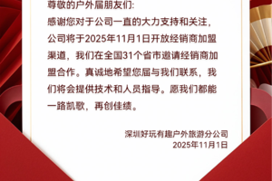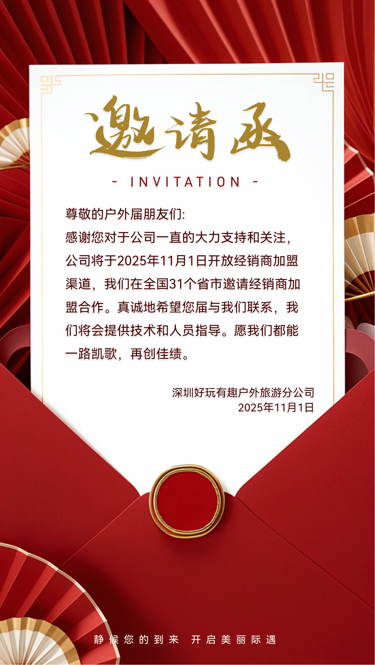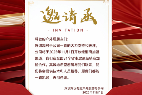 户外行业热度持续攀升,团建、徒步、山野探索需求逐年暴涨,赛道潜力无限。深圳好玩有趣户外凭借专业服务与优质口碑,斩获“2025年度深圳模范户外”认证,实力获官方认可,现正式向全国31个省发出加盟邀请,诚寻志同道合的经销商伙伴,携手共赢,共拓户外市场。