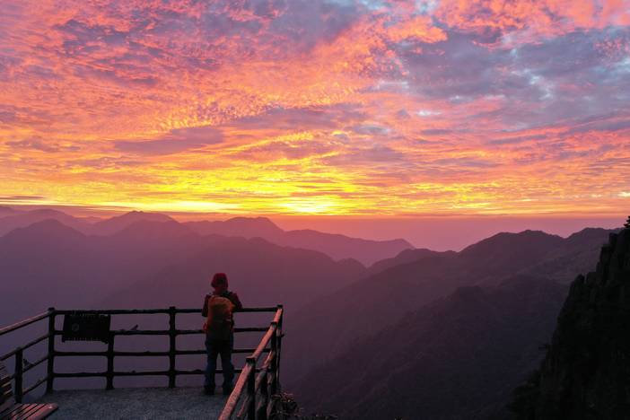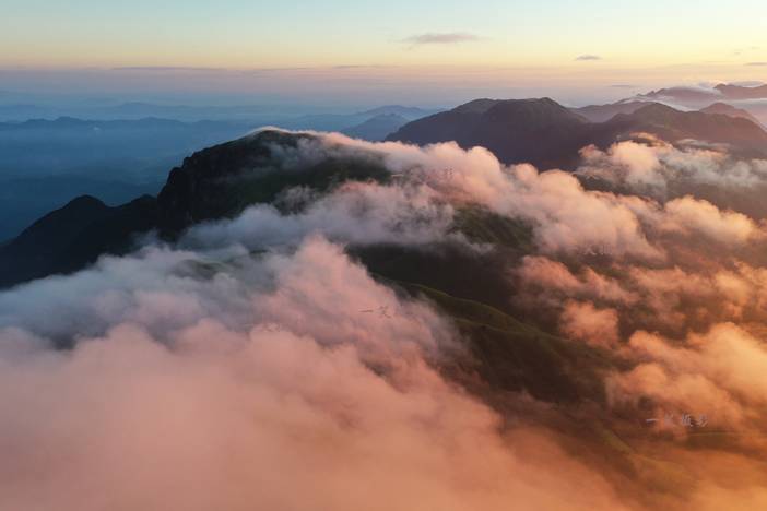 秋天武功山霞光温柔,云海翻涌,日出日落总是伴随着云海。