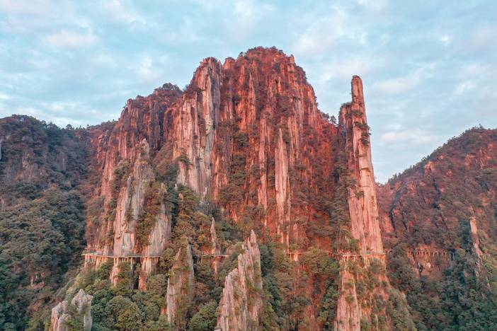 16:00左右到达【羊狮慕景区】,徒步景区栈道。不同于武功山的高山草甸地貌,羊狮慕景区以花岗岩峰林地貌为主,千姿百态,巍峨壮观。以"奇峰怪石、流泉飞瀑、山花争妍、云海幻境、雾凇飞雪"为主要特色。群峰叠嶂,苍翠欲滴,秀中藏秀,奇中出奇,佛光、云海、日出、晚霞,美不胜收,身临其境,如入仙境。徒步游览景区精华景点:日月峰、凌云台、蝙蝠峰、将军石等。