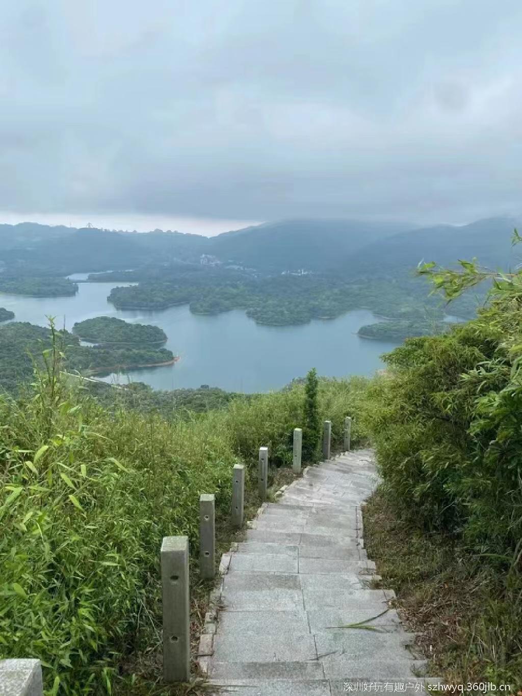 而位于最佳拍照打卡点的打鼓嶂海拔526米也是深圳十峰排行第十,这里有一条延绵向蓝色湖泊的阶梯栈道,在蓝天白云映衬下,成了深圳绝美拍照打卡点,加上鹅公髻的悬崖栈道风景,组成了深圳户外徒步一天火热路线。