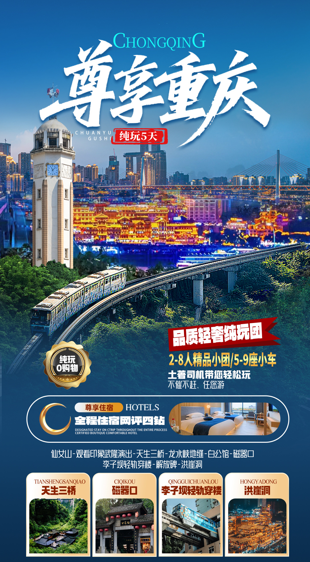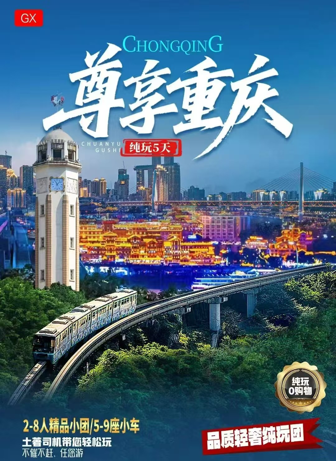 交通:广州/深圳至重庆往返机票/动车票(含机场建设费、燃油附加费)+当地5-9座车(根据人数订车型,保证一人一正座)
