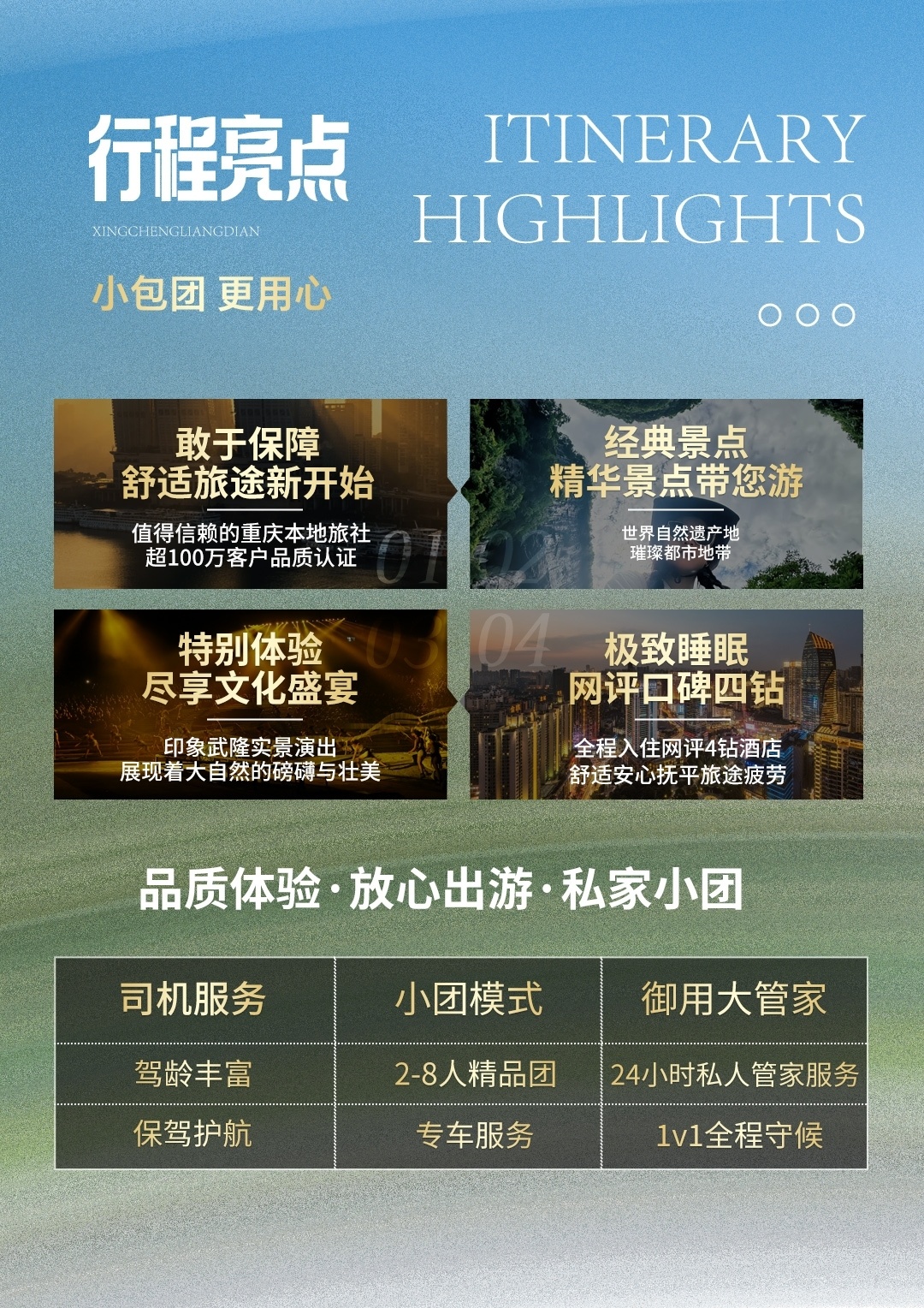 ★尊享住宿:甄选4晚网评4钻酒店 ★深度游览精华景点一网打尽 【武隆仙女山】【武隆天生三桥】【龙水峡地缝】 【李子坝轻轨穿楼】 ★轻松游玩:2-8人精品小团,土著司机带您轻松游玩 沉浸式观看价值238元非物质文化遗产大型山水实景演出-《印象•武隆》 ![]() |