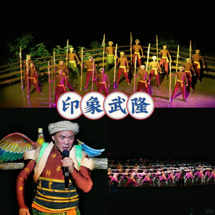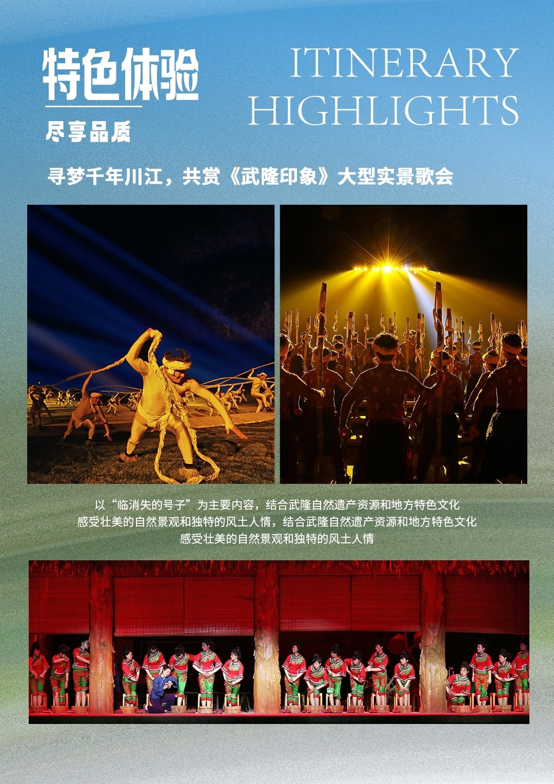 晚上观看大型山水实景演出—【印象▪武隆】(演出时间不低于70分钟)艺术和自然于天地之间,100多位特色演员现场真人真情献唱,聆听川江号子的荡气回肠,感受纤夫之爱,即使千百年的记忆远了,但现代文明与传统文化却相融了。