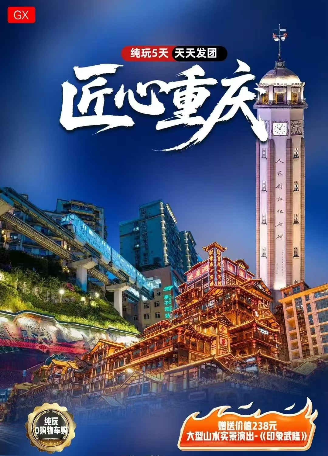 ★尊享住宿:甄选4晚网评4钻酒店,保障睡眠质量 ★尊贵体验:行程升级2+1保姆大巴车、头等舱座椅 ★巴渝美食:养生宴、蒸笼宴、特色乌江鱼、升级重庆火锅,4大美食风味餐,味蕾肆意撒欢 ★温馨服务:24小时管家服务,让游客更放心! ★品质奢享:100%真纯玩0购物0自费,1人也安排导游 ★深度游览精华景点一网打尽 【武隆天生三桥】【武隆仙女山】【龙水峡地缝】 【磁器口古镇】【解放碑】【洪崖洞夜景游】【李子坝轻轨穿楼】 特别赠送价值238元非物质文化遗产大型山水实景演出-《印象•武隆》 ![]() |