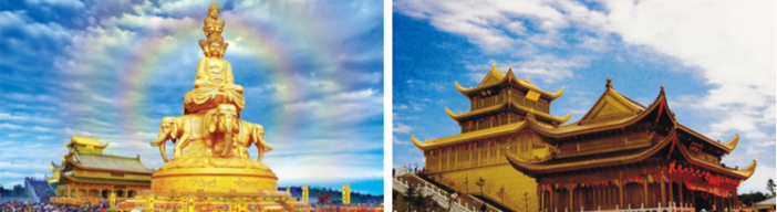 铜殿华藏寺,是世界最高佛教朝拜中心。登摄身崖,俯视川西平原的优美风光,充分感受峨眉雄秀风光。在金顶观赏世界上最高的金佛四面十方普贤金像,山顶峭拔雄峻,绝壁千仞,华藏寺金碧辉煌。