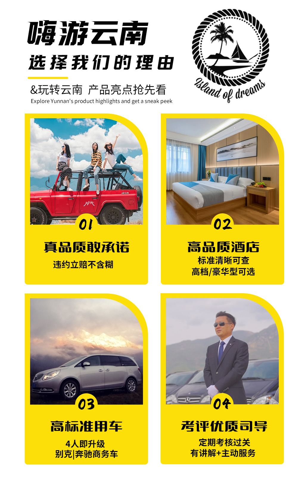 4、 行程中未含景区小交通:玉龙雪山蓝月谷景点代步电瓶车:50元/人,大理古城代步电瓶车:35元/人,大理双廊古镇代步电瓶车:20元/人,大理喜洲古镇乘坐田园小火车观光:35元/人起