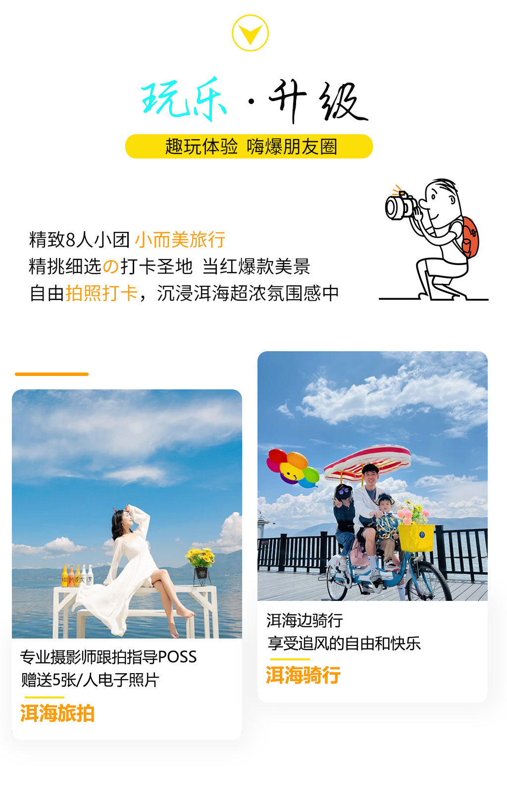 1、洱海廊道的骑行过程中,摄影师以大理洱海为背景,借助洱海边的网红道具(玻璃球、白椅子、白桌子,天空之镜等)进行拍摄,旅拍含5张/人电子照片,原片不赠送,赠送1人1杯海边茶饮。
