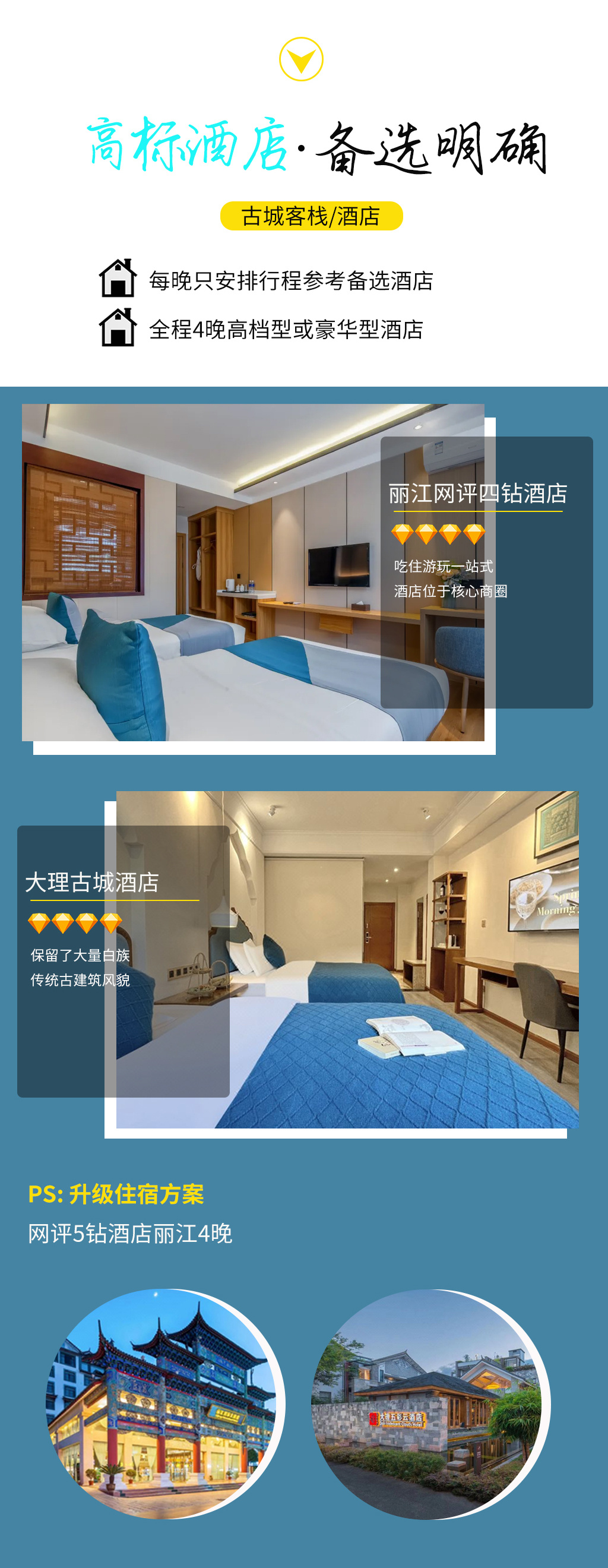 5钻酒店:丽江国际大酒店/丽歌丽呈酒店/丽江悦云别院度假酒店/丽江金林豪生大酒店/丽江复华丽朗酒店或其他同级酒店。