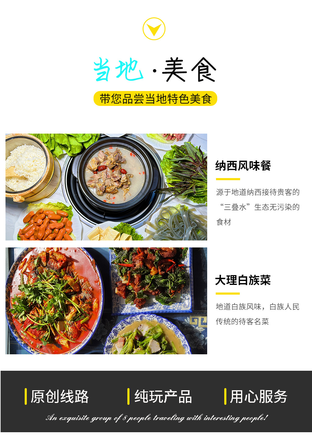 2、膳食:酒店含4次早餐,行程含2次正餐(2次民族风味特色餐40元/人/餐),赠送1次喜洲粑粑品鉴,其余行程中的用餐客人自行安排,自理费用。