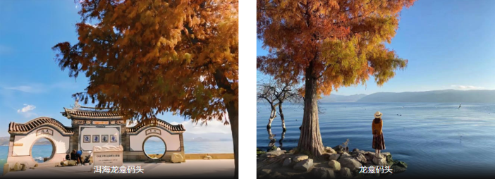 【龙龛码头】冬季与出片洱海火红水杉树相遇(打卡拍照约30分钟),利用标志性建筑“龙龛古渡 ”牌坊+洱海中笔直挺拔、倚水而立红艳似火的水杉,以洱海和蓝天为背景,选好角度,拍出美美的氛围感浓厚的照片吧!