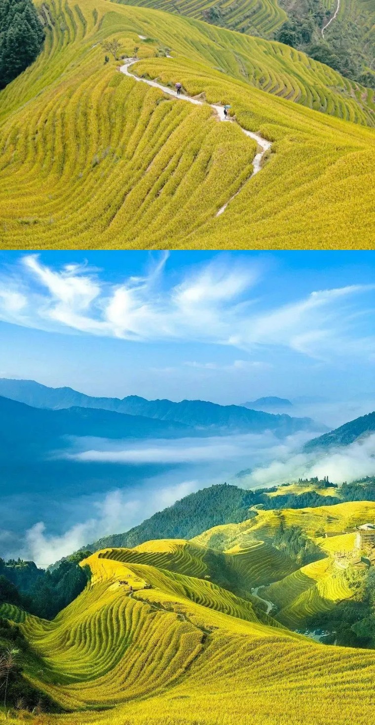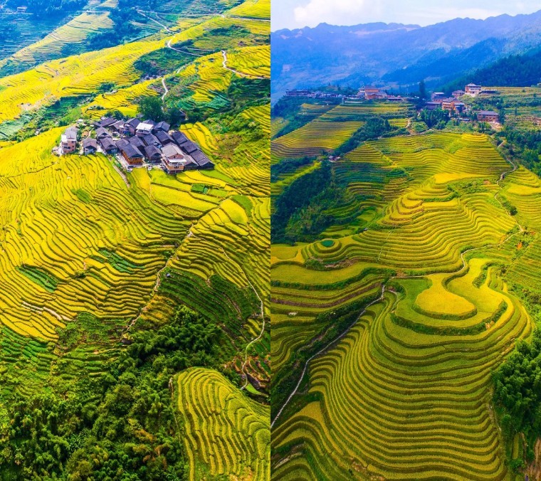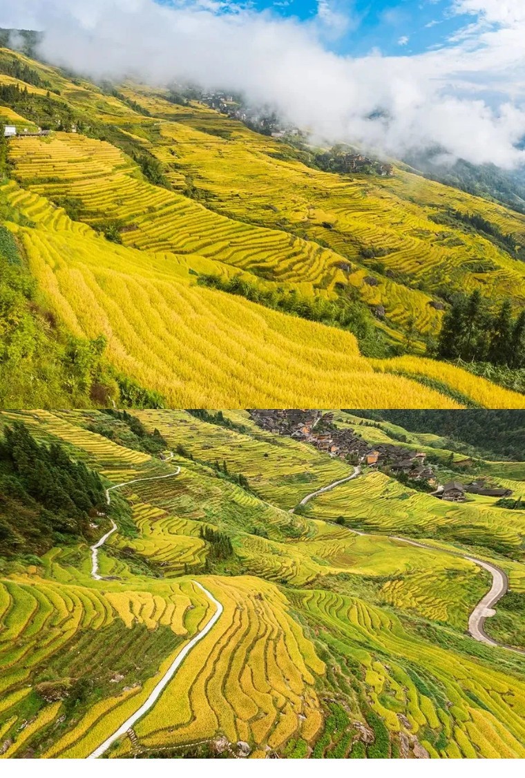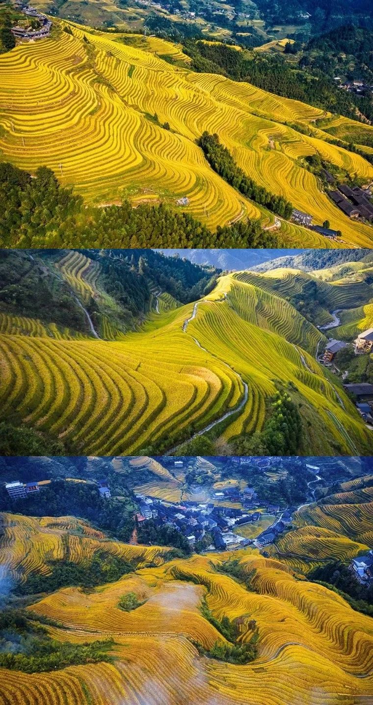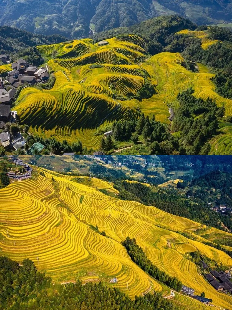 古壮寨的梯田9月中旬已成熟,最早进入金黄色的梯田