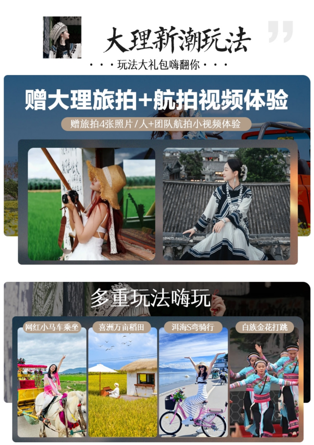 ▶ 祥云→大理理想邦(大理圣托里尼)→双廊古镇→洱海生态廊道骑行→旅拍航拍→换装打跳→小马车→大理酒店