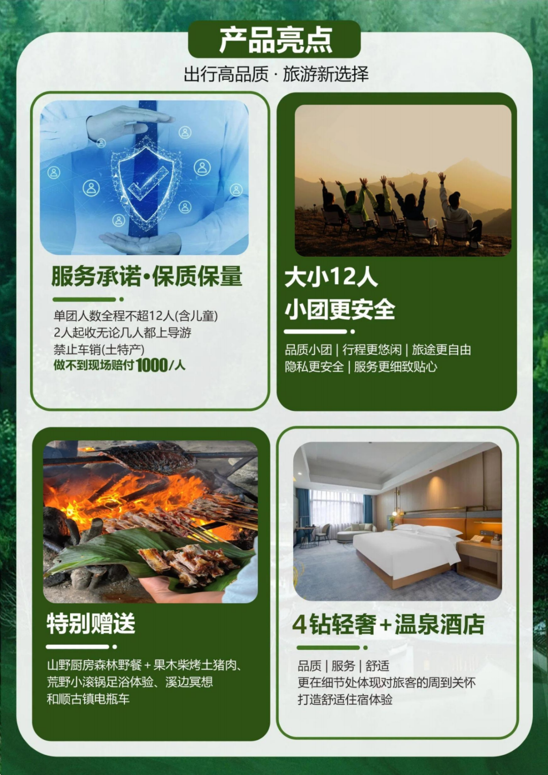 酒店用早餐,乘车前往山野厨房森林野餐+果木柴烤土猪肉。别致的森林木屋,身临其境的高黎贡山野厨房,引领我 们进入一场美食神奇之 旅!在高黎贡山森林里, 我们将品尝到森林手抓饭的鲜香、森林咖啡的浓郁、 高黎贡山古树茶的回甘、还有森林烤肉的火爆,这些美食在森林的陪伴下,绽放出无穷的诱惑与创意。 而冰凉的山泉水冰水果更是我们热辣舌尖的消暑利器,融合了水果的清甜,带来一份令人陶醉的滋味荒野小滚锅足浴体验 缓解疲劳。中草药与热水的完美融合,暖身更暖足缓解疲劳。赠神秘 惊喜盲盒!!