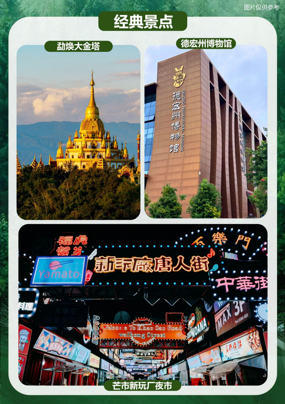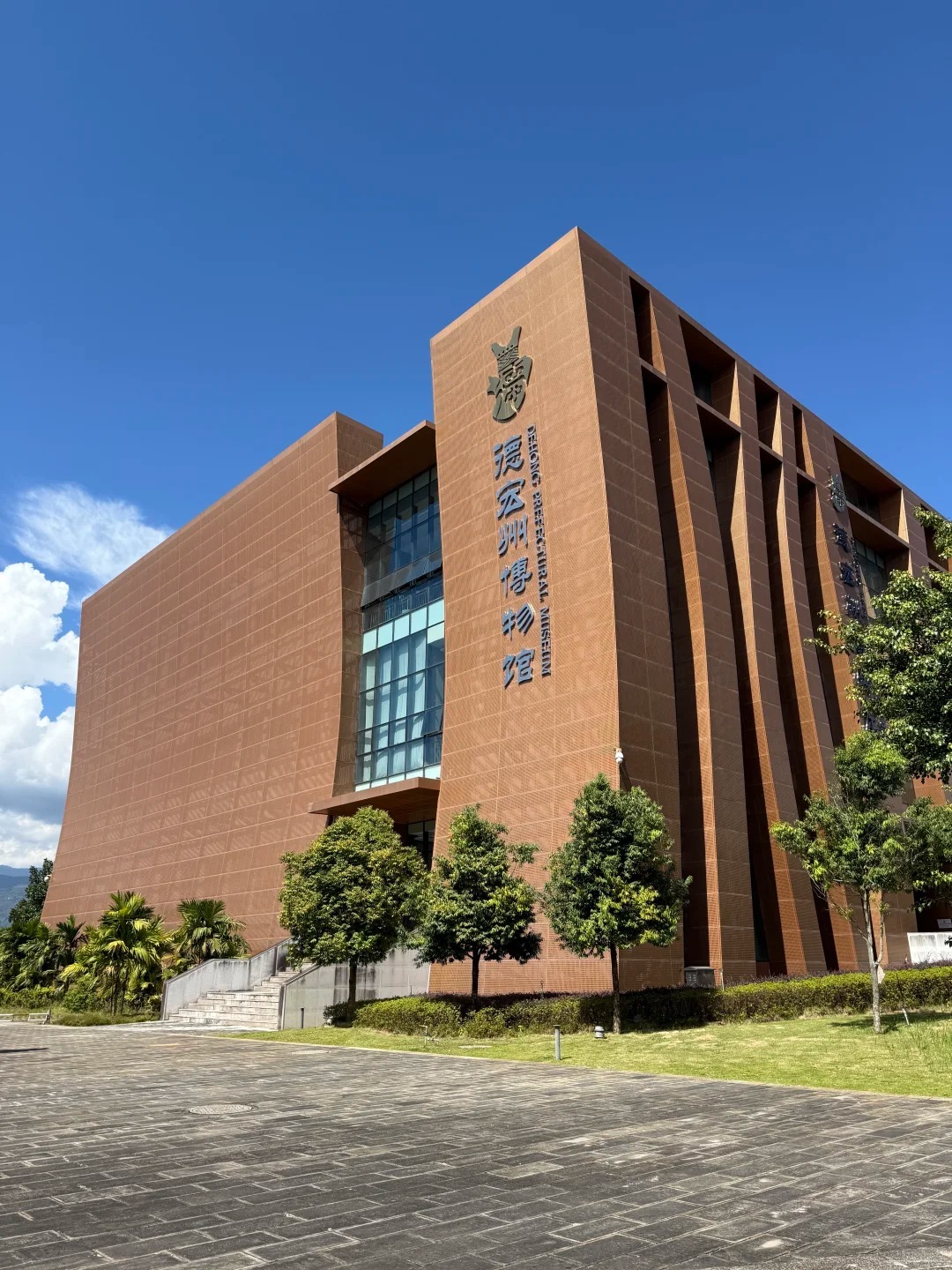 游览【德宏州博物馆】,德宏州博物馆是独具特色的德宏州第一个德昂族博物馆,是德宏州“三馆”项目之一,博物馆建筑风格现代,外观呈不规则的立方体,形似一方“宝盒”,外墙肌理抽象地表现了亚热带榕树的根系,墙面采用云南高原赭红土色,寓意“植根德宏,面向四方;收藏德宏,筑梦文博”。展出历史、民族民俗文物及展品840余件套,其中国家珍贵文物30余件套,包括文物“龙江型不对称铜钺”衍生的馆标。基本陈列以“西南丝绸之路上的璀璨明珠”为主线,分设序厅、自然厅、历史厅及民族厅、辐射厅,全景展现德宏从西汉滇越乘象国到现代自治州的历史脉络、生态资源及多民族文化。(周一闭馆更改为夜游傣族古镇)