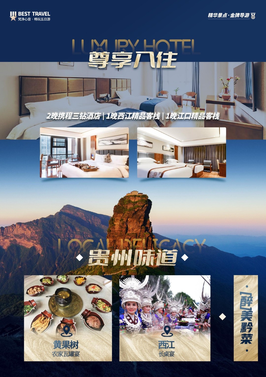(注:1.【甲秀楼】为赠送景点无任何退费;2.由于梵净山景区实行全网实名制购票且每日限购门票;旺季梵净山门票紧张,如梵净山东西门都未预约到门票,旅行社根据情况调整为其他景区或退费200元/人,敬请谅解!)。