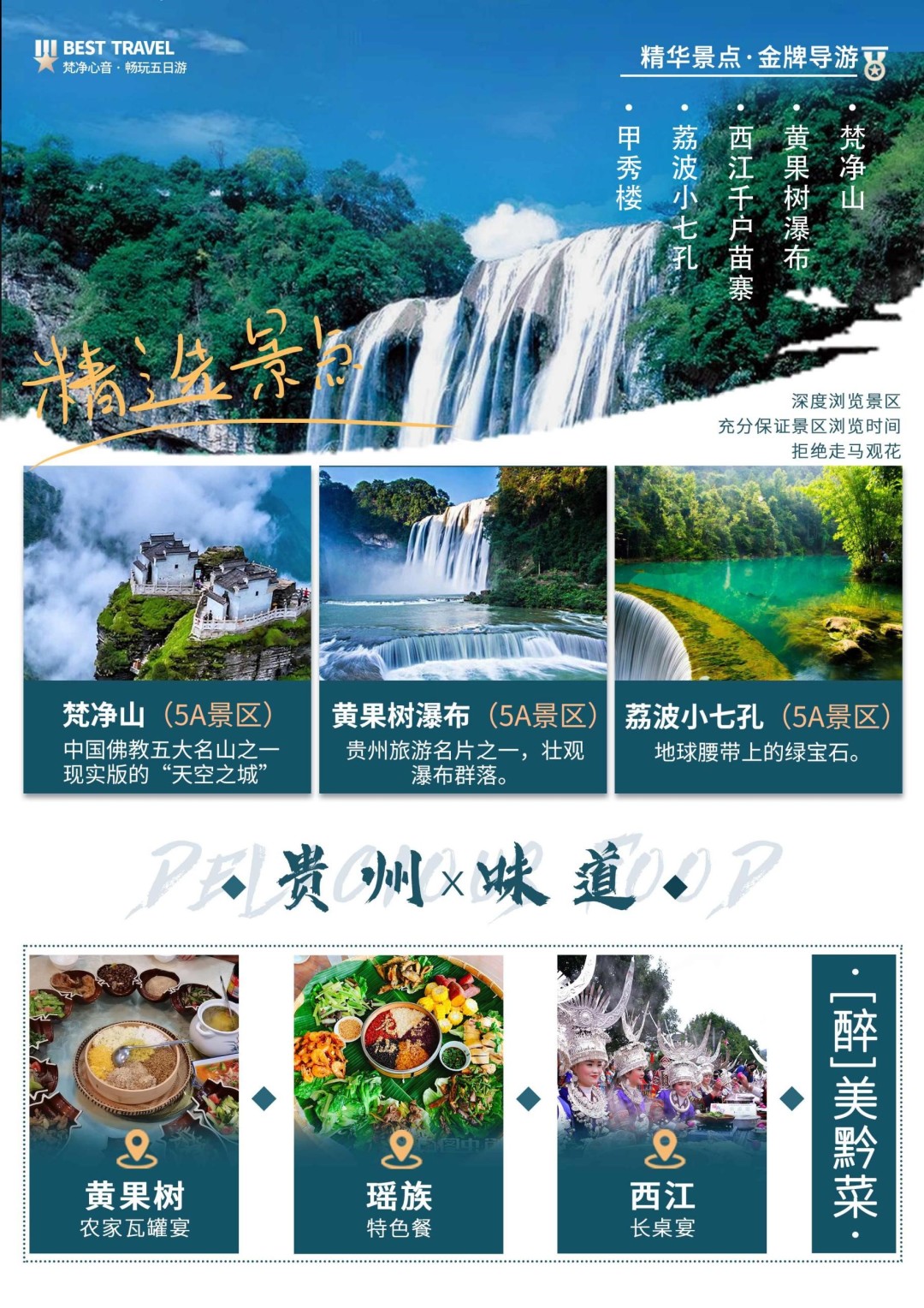 4. 门票:含梵净山门票;含黄果树套票联票;含荔波小七孔门票;含西江苗寨门票。(注:【甲秀楼】为赠送景点无任何退费)