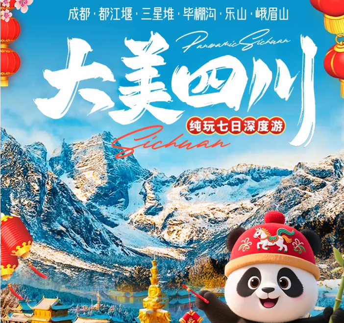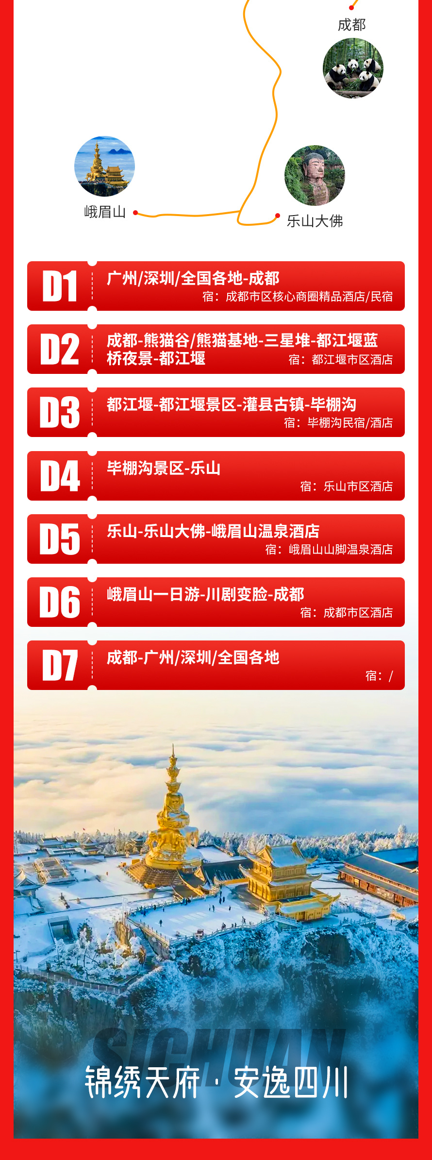 4.门票:行程所列景点门票(乐山大佛,峨眉山,三星堆,毕棚沟,都江堰,熊猫基地,)