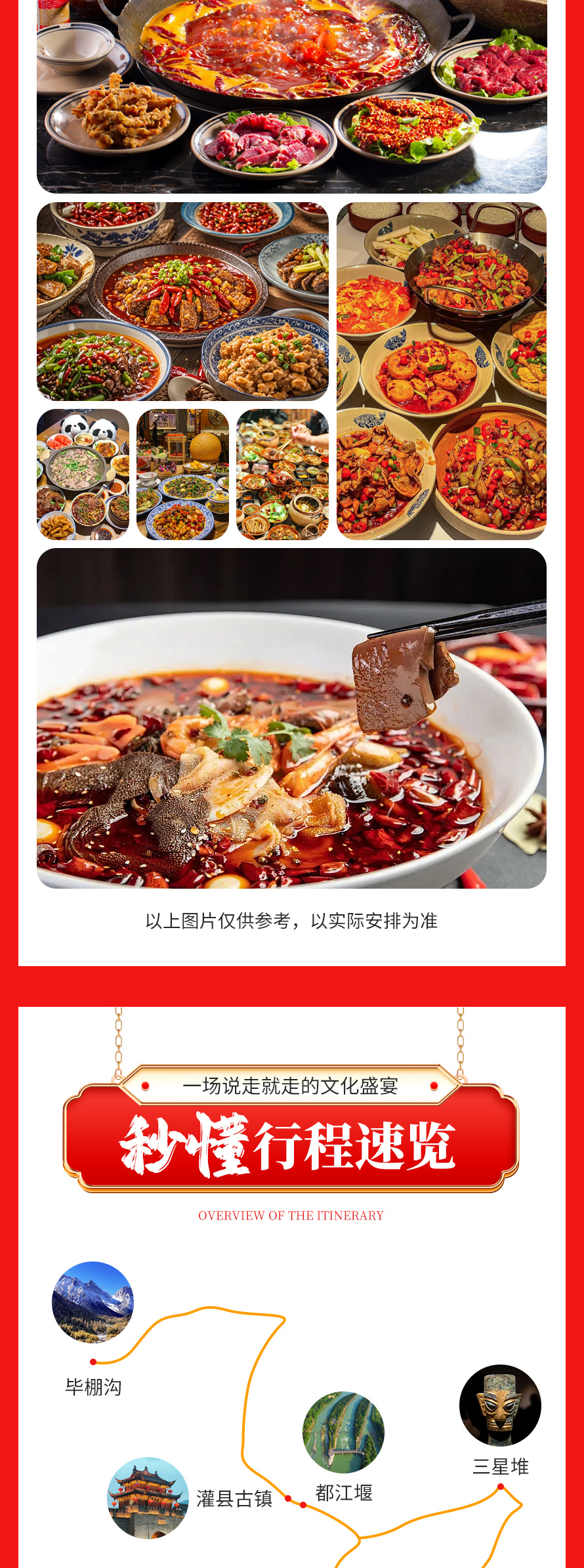 2.用餐:全程酒店含早,含一正特色川菜。其他中晚餐自理,自由结伴品尝当地美食;0215团期出发的小伙伴,统一安排0216日年夜饭(此项目为赠送,不用不退),