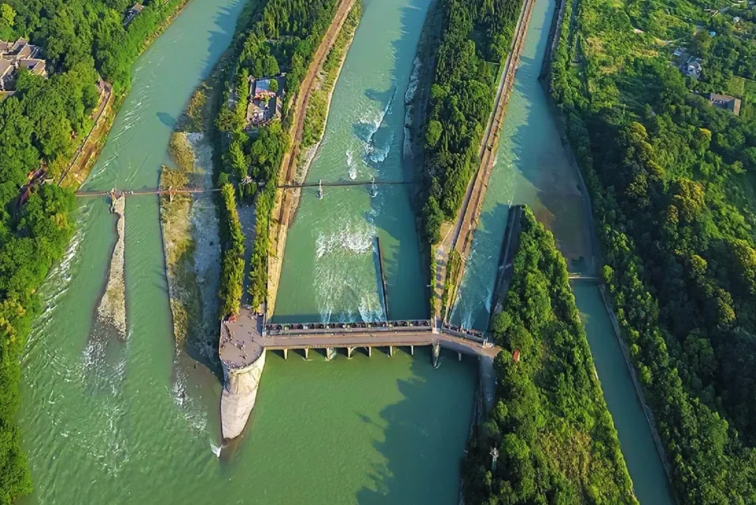 鱼嘴分水堤:形如鱼头,将岷江分为内江(灌溉)和外江(泄洪),通过弯道环流原理实现枯水期六成水入内江、洪水期六成水入外江的自动调节。