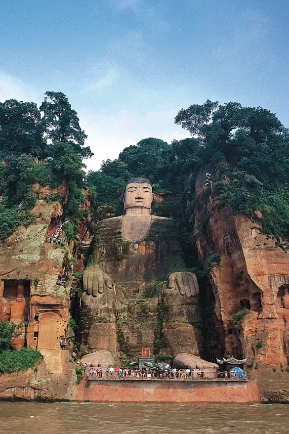 乐山大佛头与山齐,头高14.7米、宽10米,发髻1051个,耳长7米,依山凿成临江危坐,神势肃穆,大气磅礴。大佛左右两侧沿江的崖壁上,还有两尊身高超过16米的护法天王像。大佛右侧有一条九曲古栈道,是唐代开凿大佛时留下的施工和礼佛山道,沿绝壁开凿而成,曲折九转,奇陡无比。大佛雕凿完成后,曾建有7层楼阁覆盖(另有9层或13层之说),时称“大佛阁”“大像阁”。但佛阁屡建屡毁。乐山大佛是中国古代劳动人民智慧的结晶,是世界文化史上的奇迹。