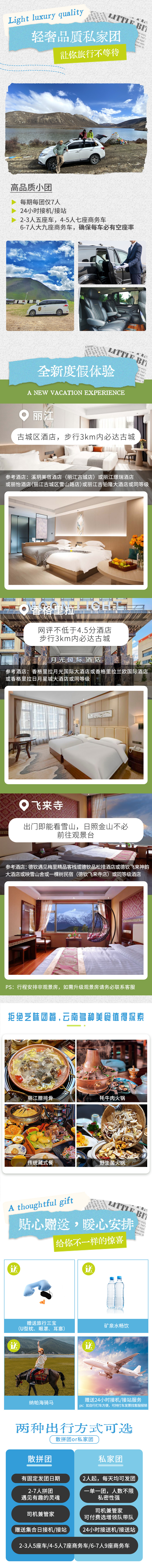 1、住宿:丽江三钻酒店1晚(参考酒店:溪玥美宿酒店(丽江古城店)或丽江璟瑞酒店或丽怡酒店(丽江古城区雪山路店)或丽江吉铂隆大酒店或同等级),飞来寺酒店/民宿/客栈1晚(参考酒店:德钦遇见梅里精品客栈或德钦品松措酒店或德钦飞来神韵大酒店或映雪山舍或一棵树民宿(德钦飞来寺店)或同等级酒店),香格里拉四钻酒店1晚(参考酒店:香格里拉月光国际大酒店或香格里拉兰欧国际酒店或香格里拉日月星城大酒店或同等级);