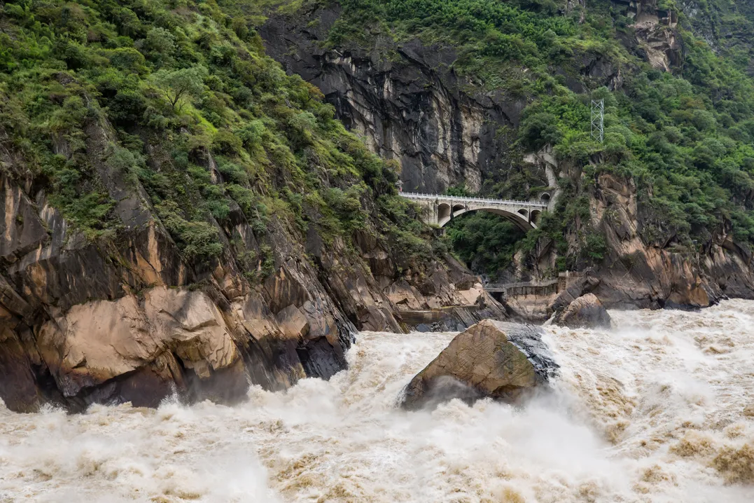 10:00 抵达【虎跳峡】。虎跳峡沿途是世界十大著名徒步线路之一,金沙江峡谷的苍翠与奔涌而下的江水构成了美丽的画卷,我们将来到【上虎跳峡】,这里是整个峡谷中最窄的一段,江心有一个13米高的大石—虎跳石,江流与巨石相互搏击,山轰谷鸣,气势非凡。
