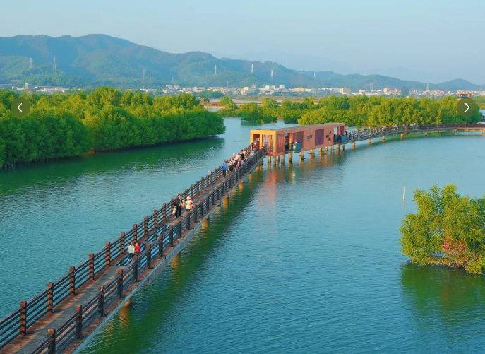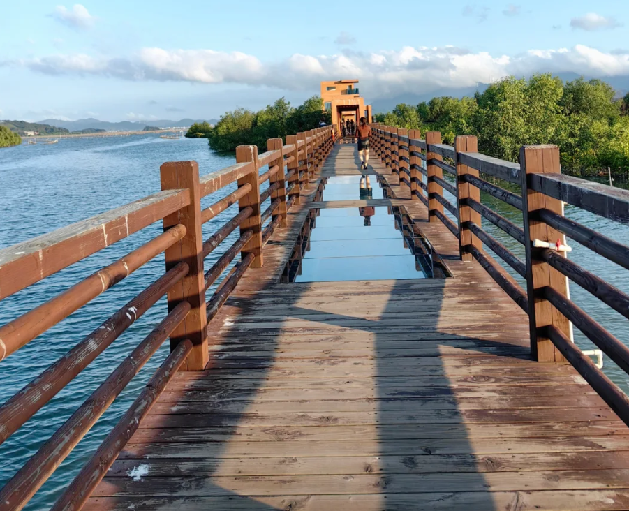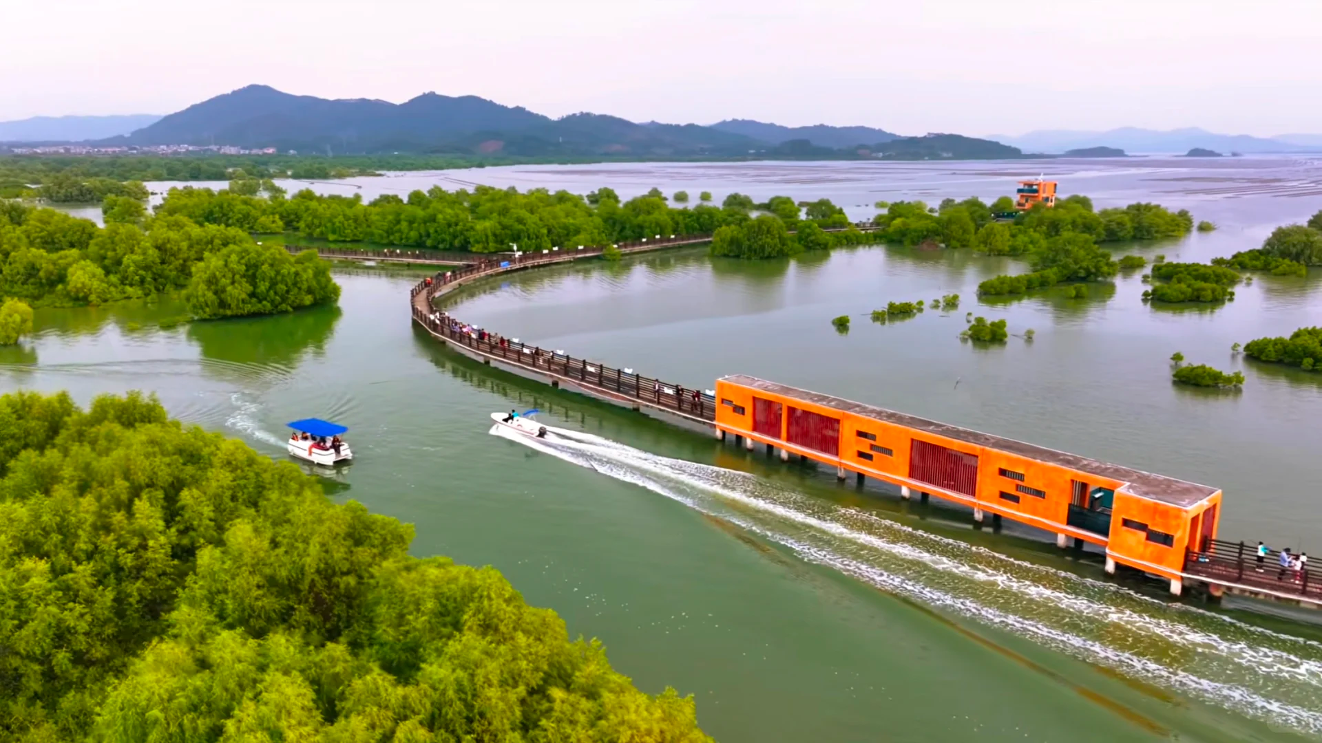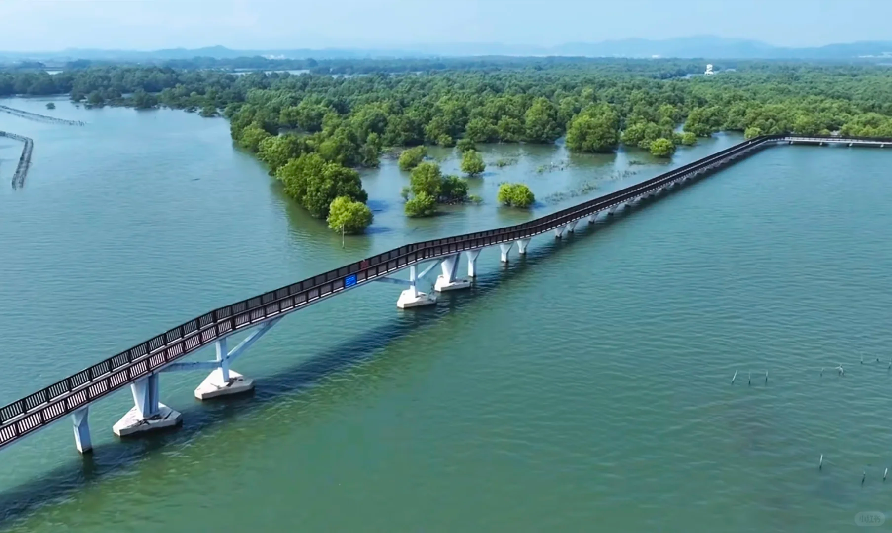 全长约6公里的景观栈道蜿蜒于红树林间,部分玻璃地面设计让脚下招潮蟹、跳跳鱼的活动清晰可见,沿途科普长廊“一步一景一知”,随手就能拍出“树在水中长,鸟在枝上鸣”的生态大片。