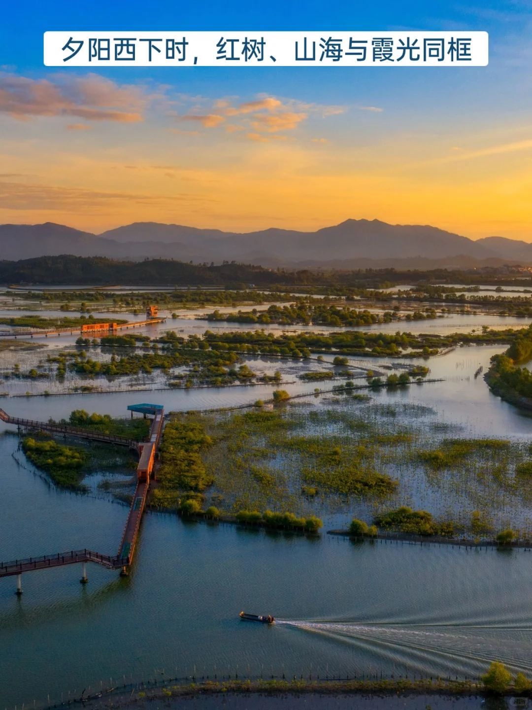 乘船漫游考洲洋是必体验!游船穿梭于红树水道,近距离观赏红树林根系与海水相拥的奇观,夕阳西下时,红树、山海与霞光同框,人在画中游的意境绝美。