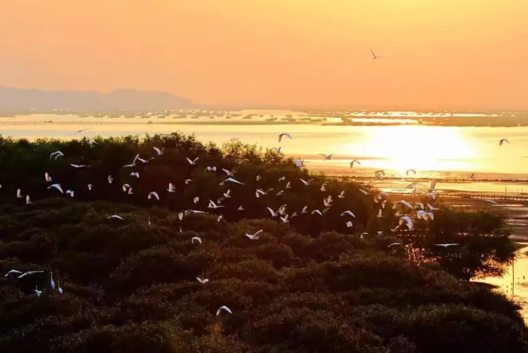 盐洲岛最出名的莫过于白沙村那片红树林湿地生态园了这里常年栖息着成千上万的野生白鹭它们或成群结伴飞翔或水面嬉戏,景象极为壮观