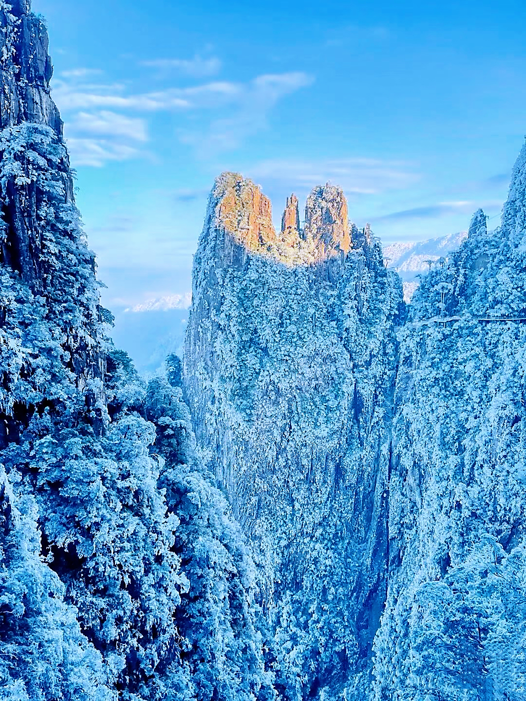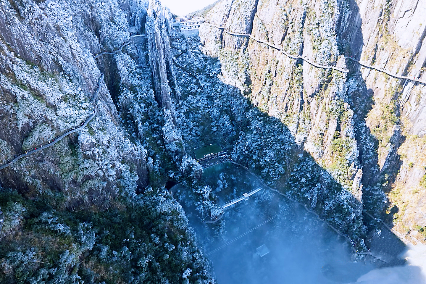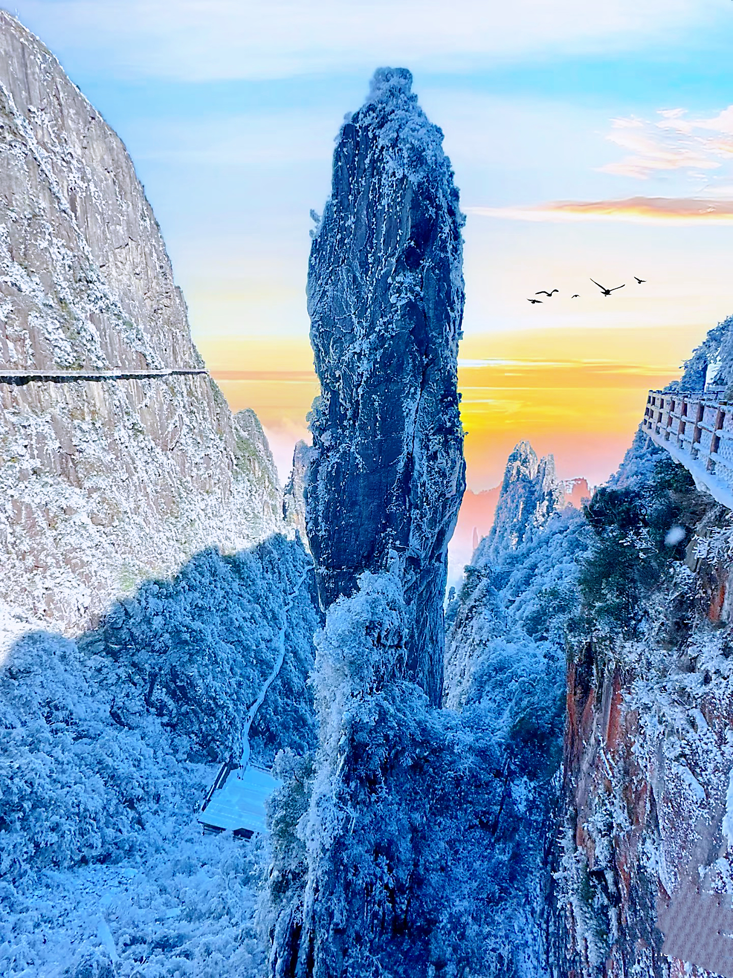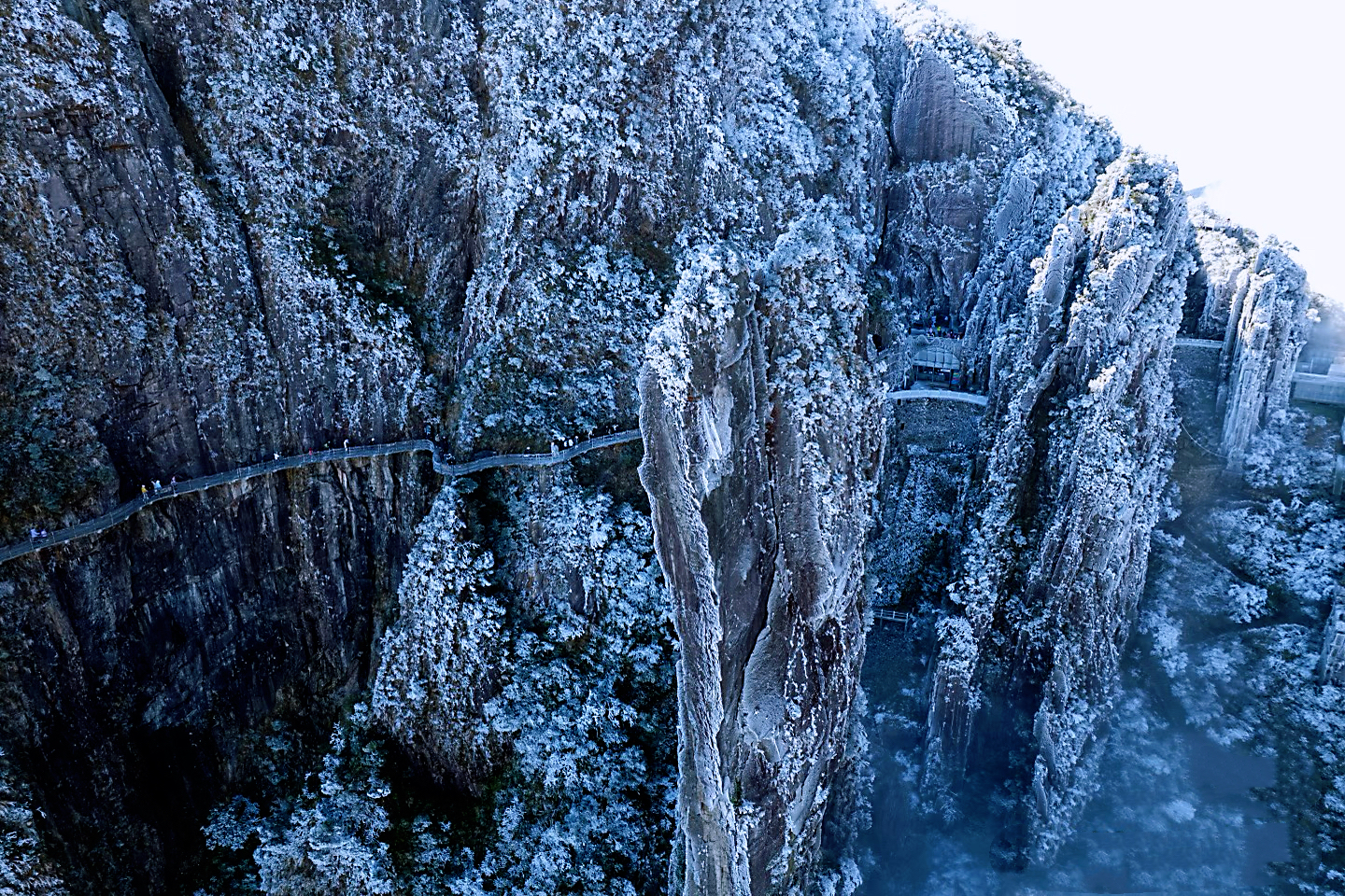 13:00 体验垂直观光电梯(电梯不含在大门票里面,建议乘坐,自理费用:单程40元/人),沿着悬空栈道一路经过金鞭大峡谷-东天门-七星崖-大天台,大天台号称“中南第一险”,运气好可以看到壮观的云海、雾凇奇观;