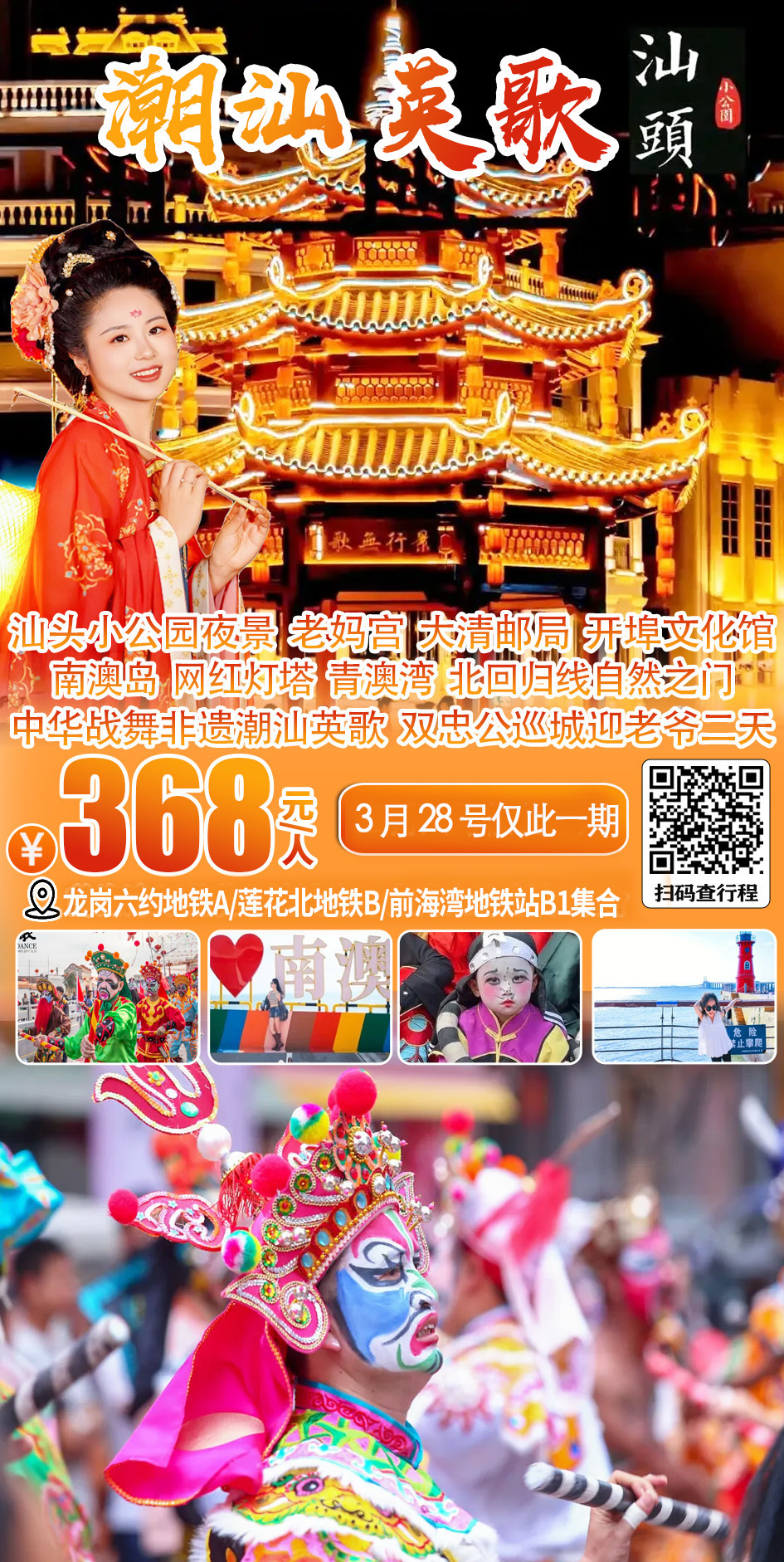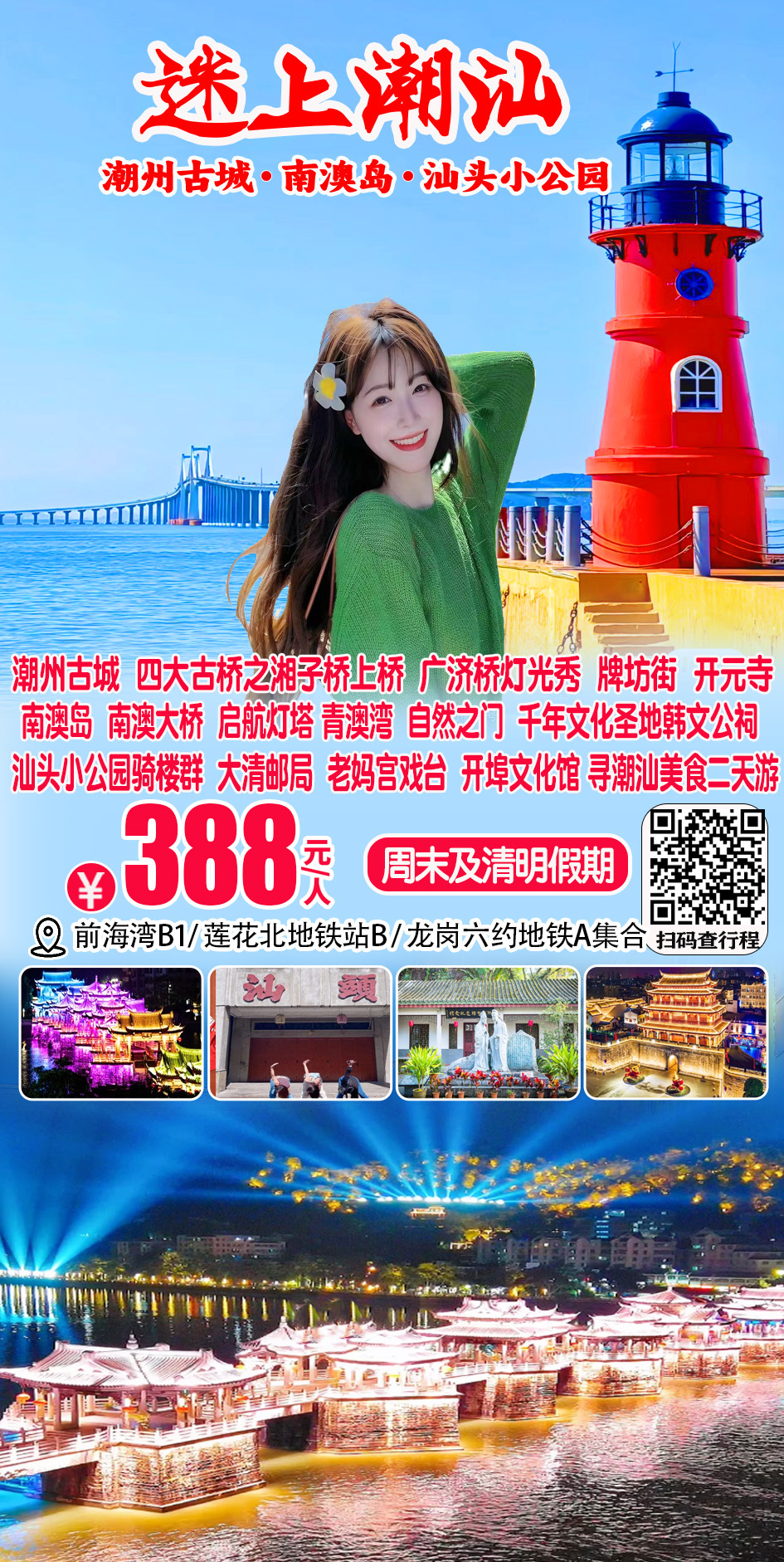 (周六及假期)汕头南澳岛+网红灯塔+青澳湾+北回归线“自然之门”+汕头小公园+老妈宫+大清邮局+开埠文化馆+韩文公祠+广济桥上桥+潮州古城+牌坊街+开元寺+灯光秀,寻潮汕美食二天 388
