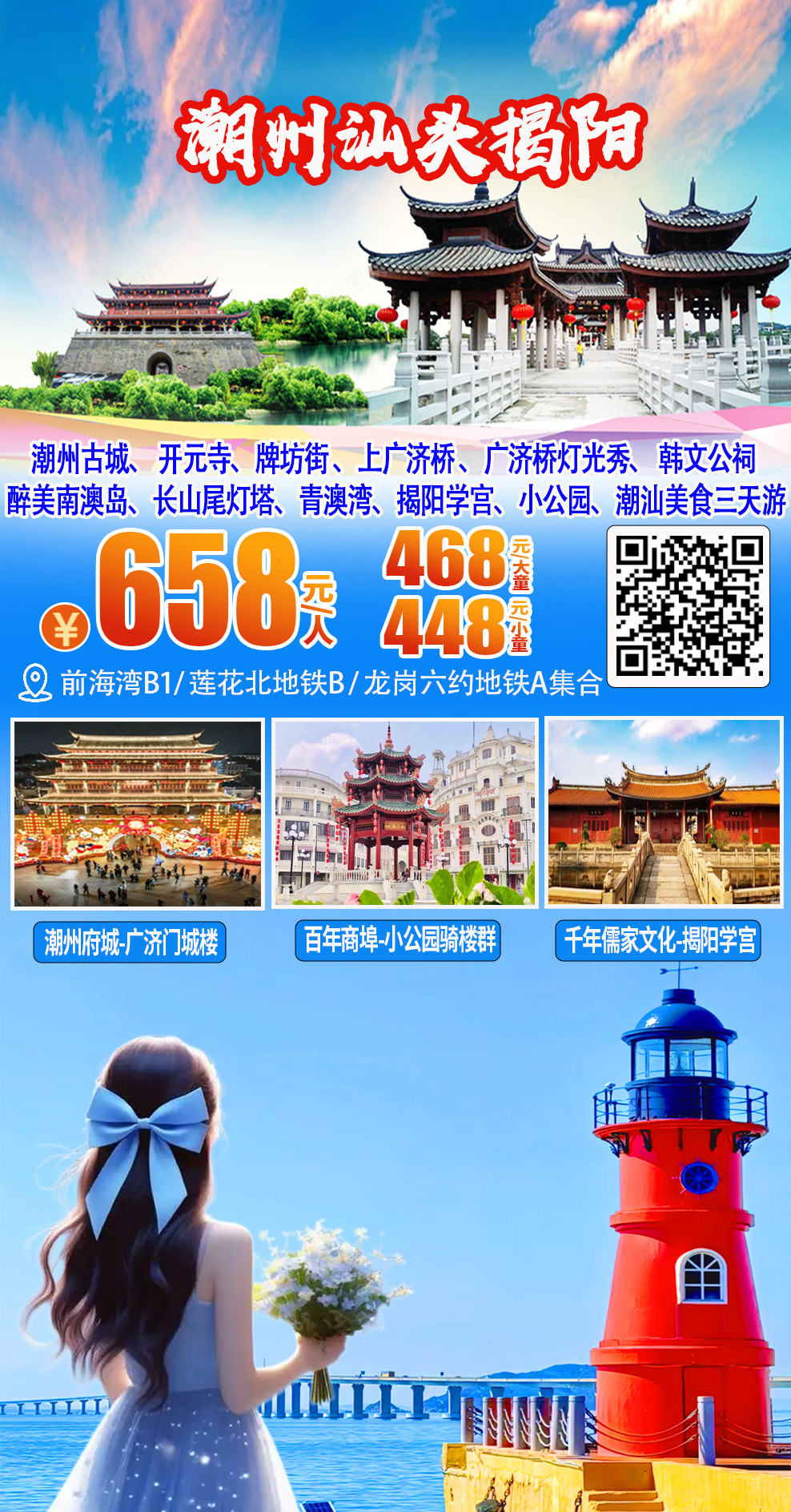 (周五及假期)潮洲+汕头+揭阳三城联游,汕头小公园、南澳岛、青澳湾、潮州古城、湘子桥、牌坊街、开元寺、韩文公祠、 揭阳古城、 揭阳学宫、城隍庙、 品潮汕美食三天 658