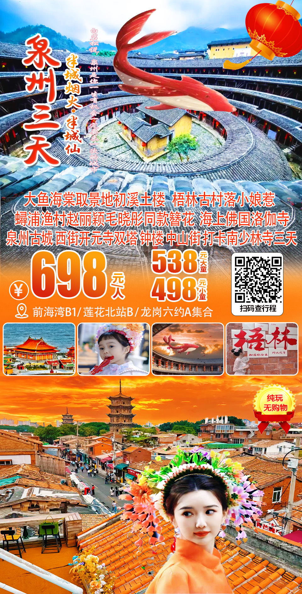 (周五及假期)大鱼海棠初溪土楼、蟳浦簪花、海上佛国洛伽寺、梧林古村落小娘惹、泉州古城、中山街 、西街、开元寺、少林寺三天游 698,