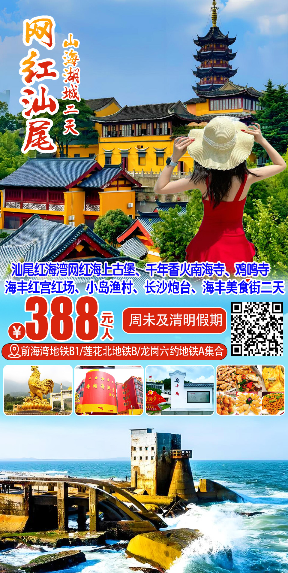 (周六及假期)汕尾红海湾网红海上古堡、南海寺、红宫红场、鸡鸣寺、小岛渔村、长沙炮台、海丰美食街二日游 388