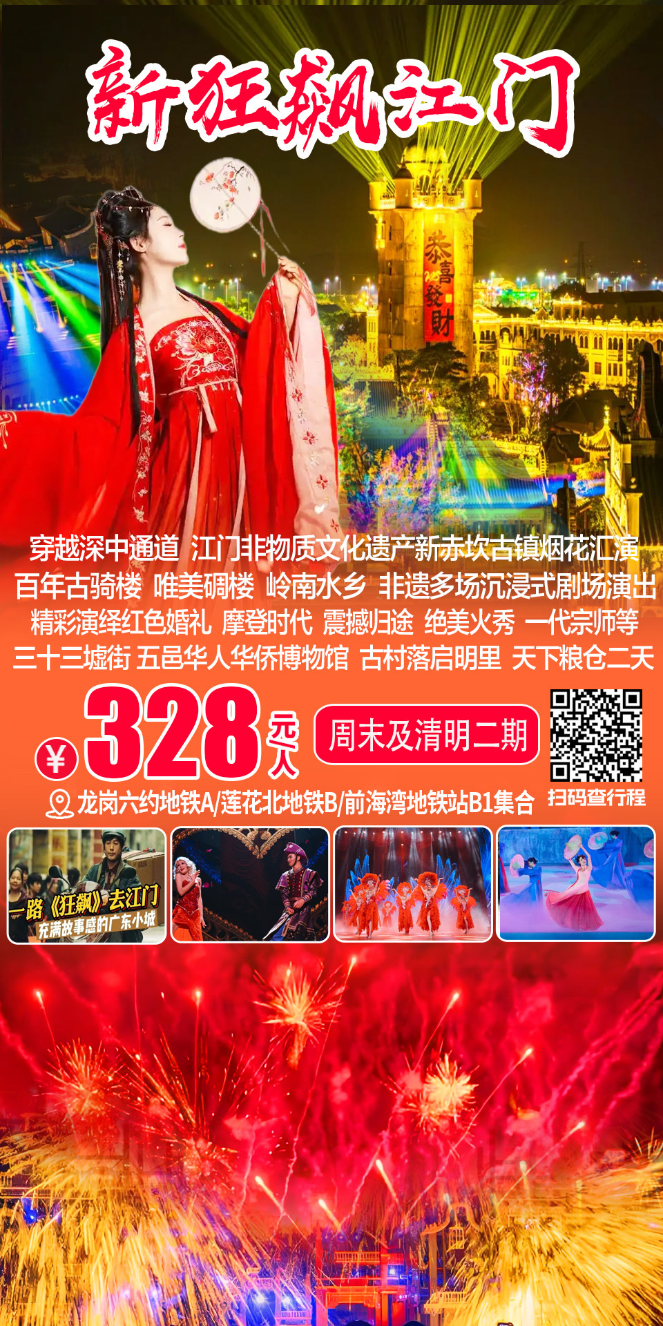 (周末及假期)穿越深中通道、狂飙江门新赤坎古镇烟花秀非遗打铁花、三十三墟街、五邑华人华侨博物馆、百年古村落启明里、天下粮仓二天游 328