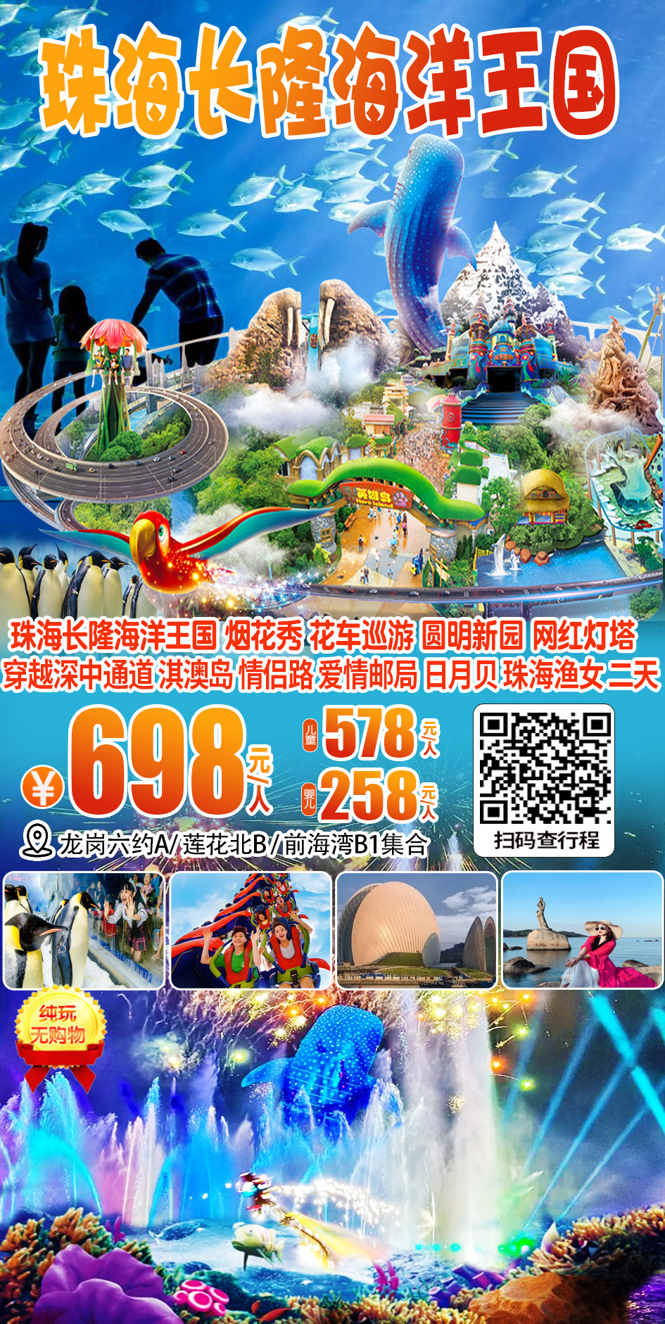 (周末及假期)穿越深中通道,珠海长隆海洋王国、烟花秀、淇澳岛、圆明新园、情侣路、远观港珠澳大桥、日月贝、珠海渔女、网红灯塔二天 698