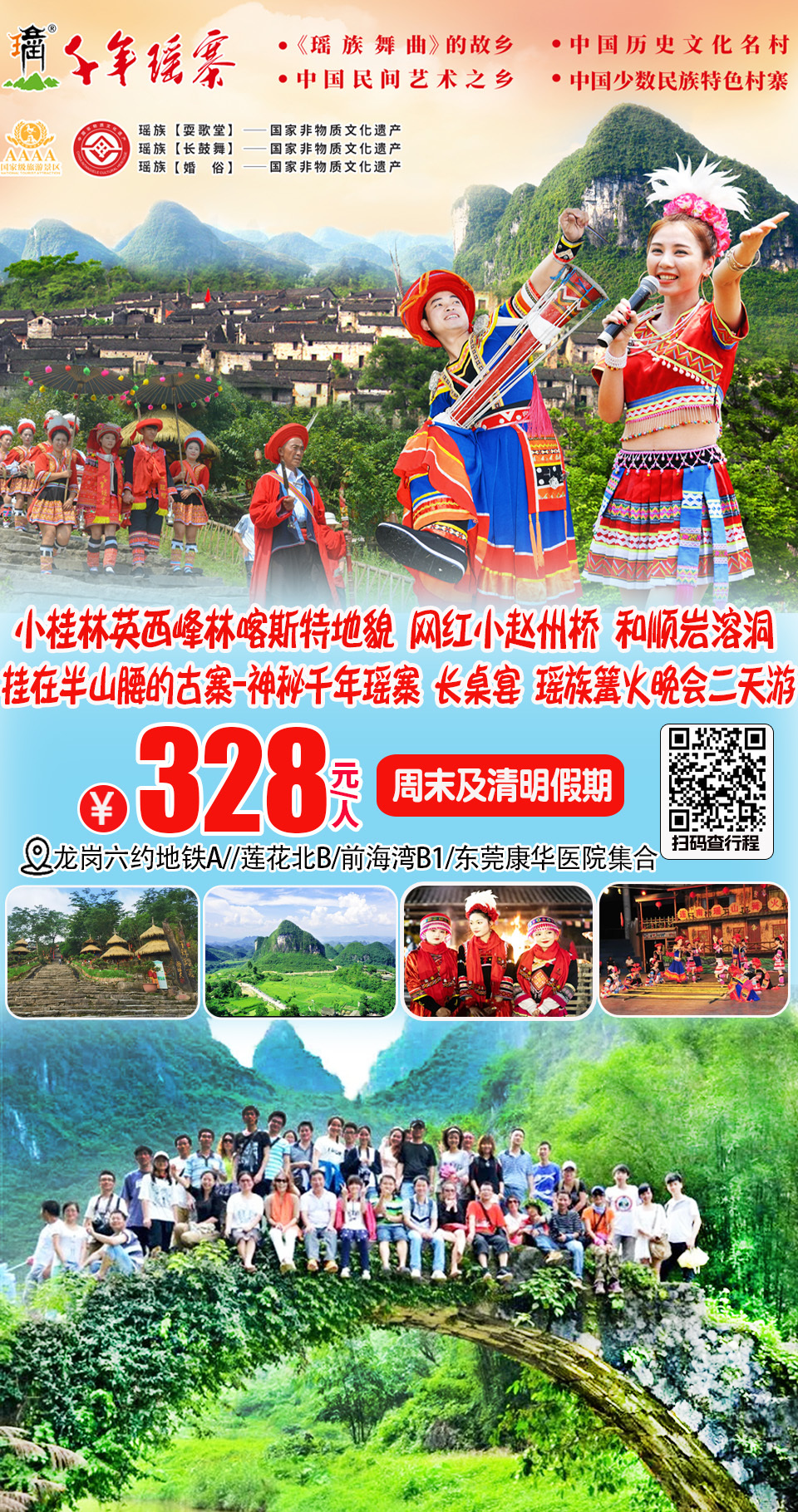 (周末及假期)挂在半山腰的神秘古寨-千年瑶寨、小桂林英西峰林喀斯特地貌,网红小赵州桥、和顺岩溶洞、竹竿舞、瑶族篝火长桌宴二日游328,深圳/东莞