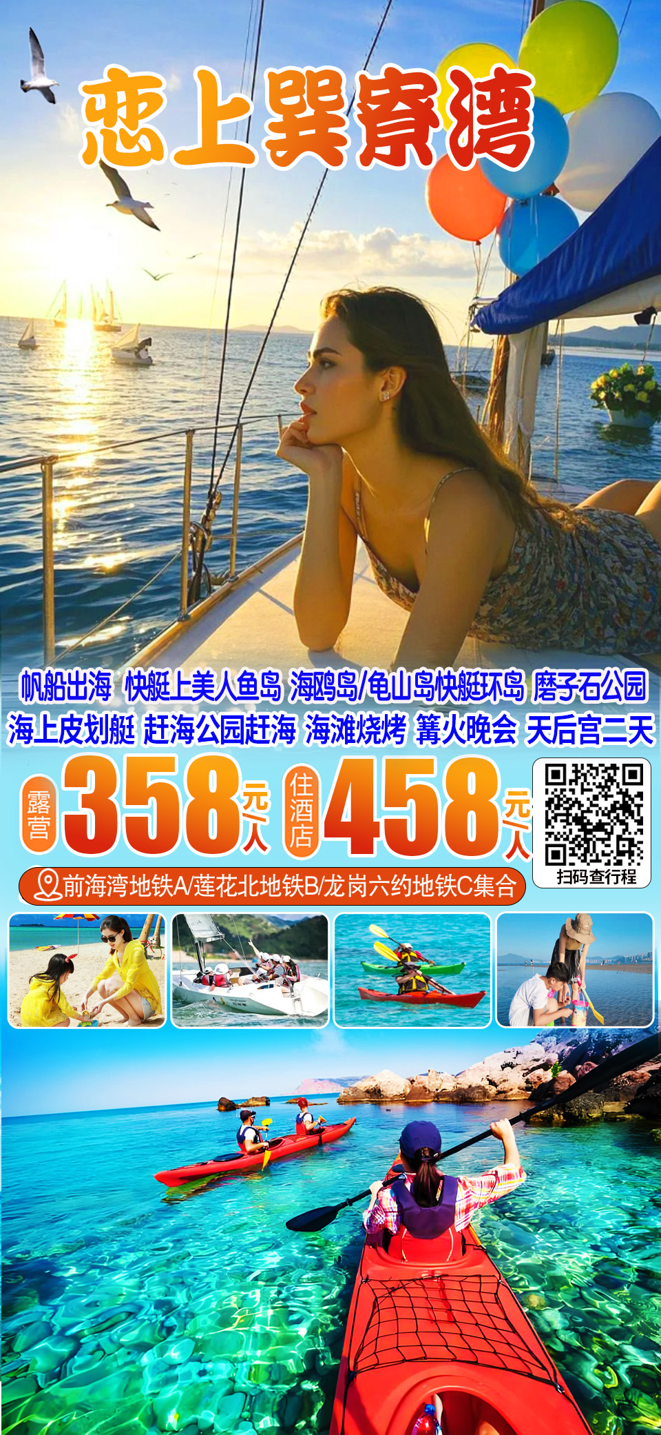 (周末及假期)巽寮湾帆船出海、海上皮划艇、快艇上美人鱼岛、海鸥岛/龟山岛快艇环岛、双鱼岛、赶海公园、天后宫、海滩烧烤、篝火晚会二日游358