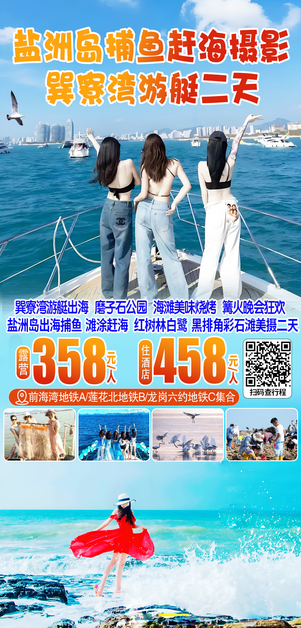 (每周六及假期)巽寮湾游艇出海、盐洲岛滩涂赶海、红树林白鹭、出海网鱼、黑排角彩石滩美摄、海滩美味烧烤、磨子石公园二天游358