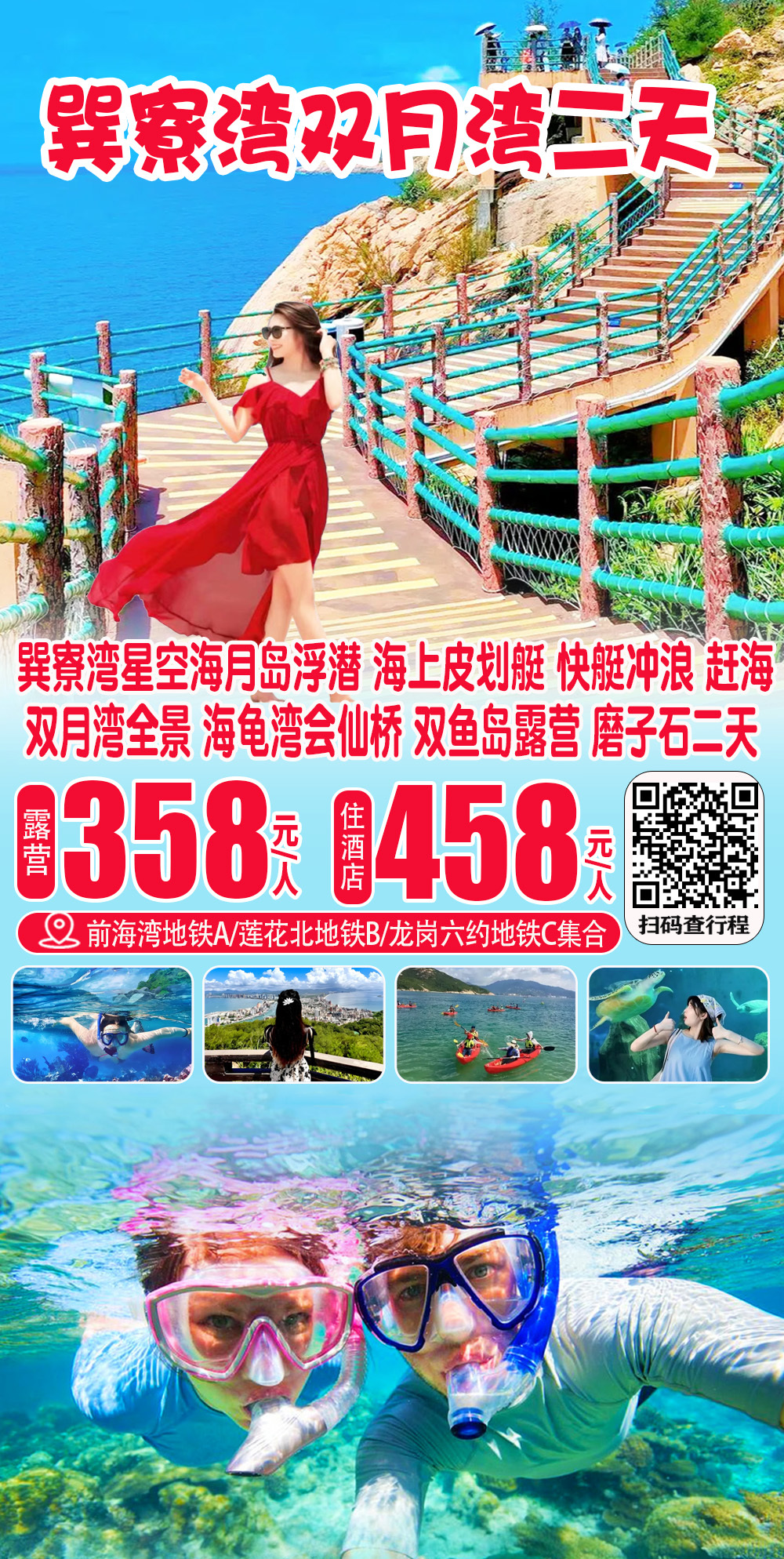 (周六及假期)巽寮湾情人岛浮潜、海上皮划艇、快艇、蹦床、网红海龟湾、双月湾全景、巽寮湾双鱼岛露营、磨子石二天
