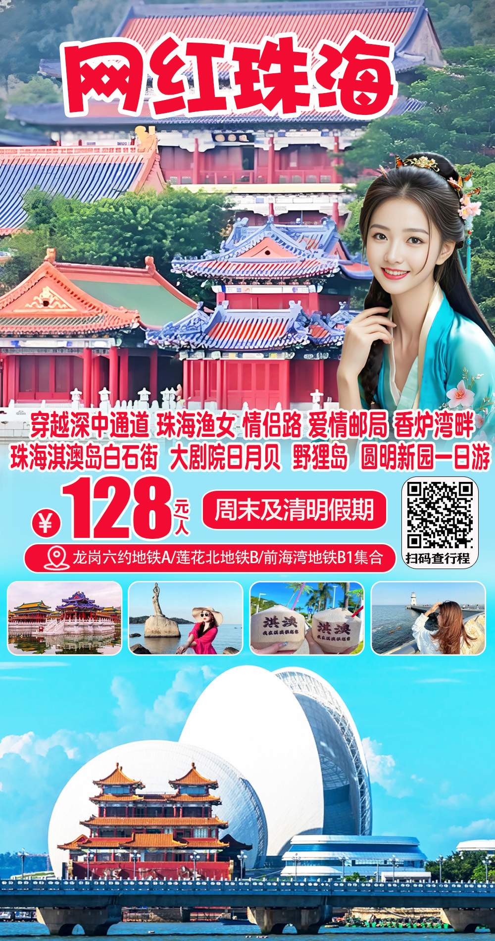 (周末及假期)穿越深中通道 珠海淇澳岛白石街 情侣路 珠海渔女 香炉湾畔 城市阳台 野狸岛 大剧院日月贝 圆明新园一日游128