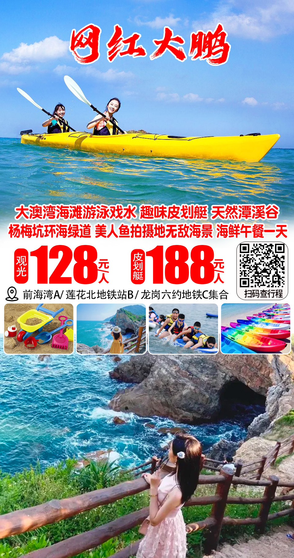 (周末及假期)杨梅坑环海绿道、人鱼洞无敌海景、沙滩海泳戏水、海上皮划艇、海鲜农家菜午餐一天 108