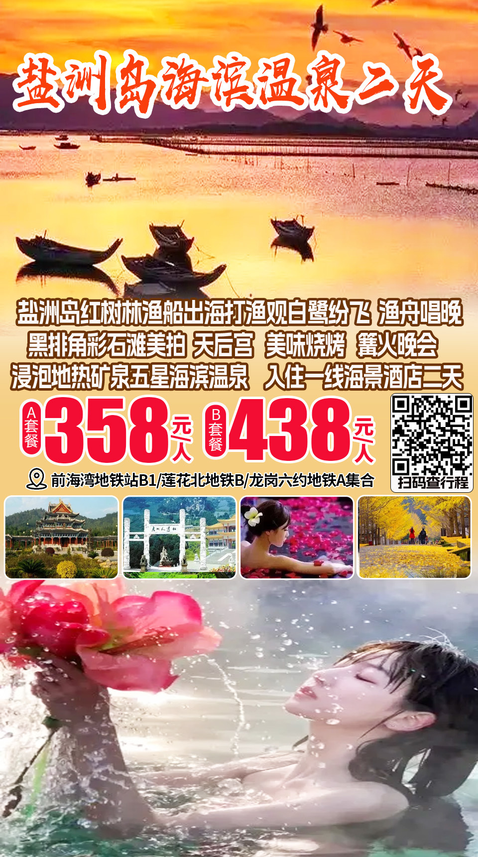 盐洲岛红树林渔船出海打渔观白鹭纷飞、渔舟唱晚、黑排角彩石滩美拍、美味烧烤、篝火晚会、海滨温泉、天后宫二天