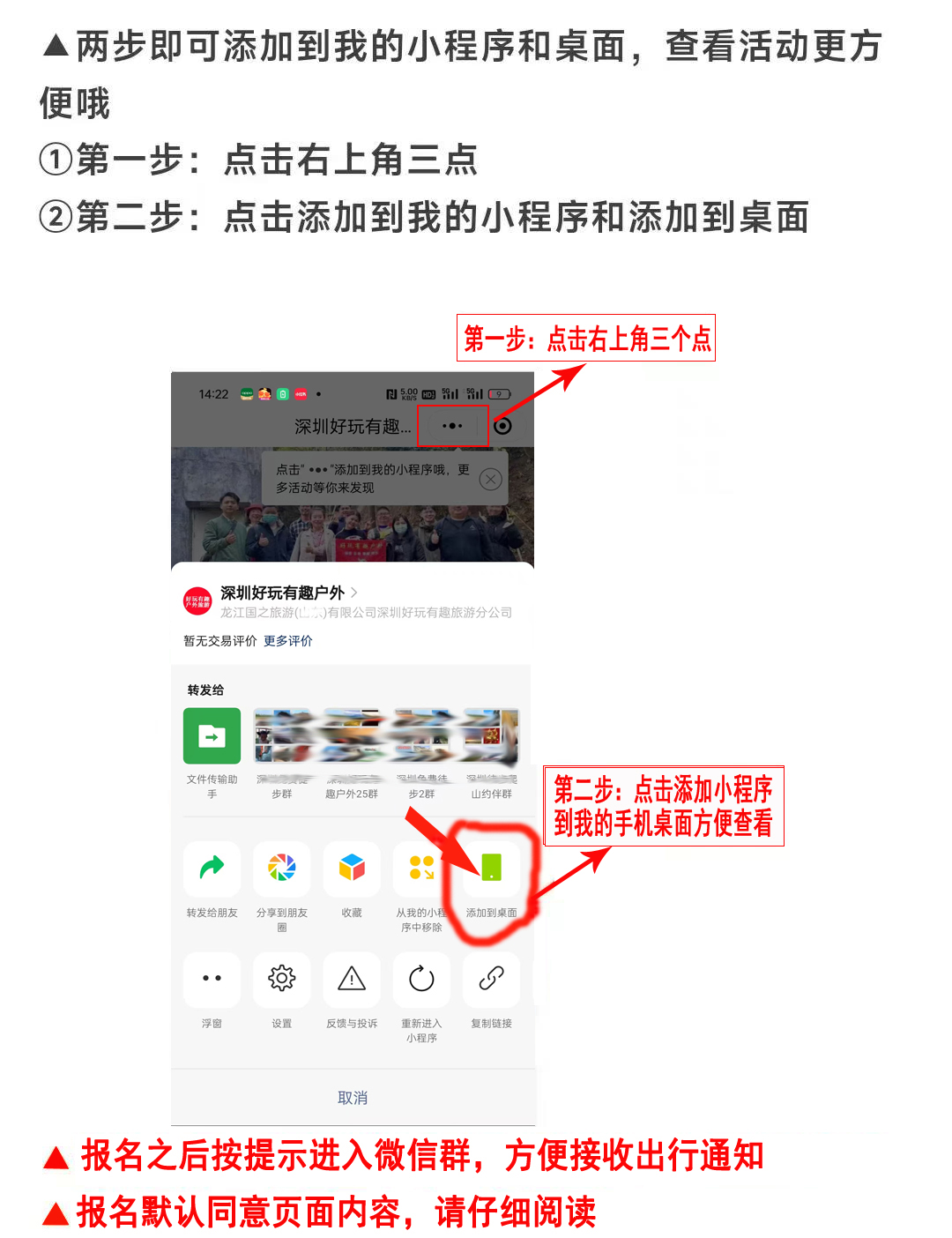 方案二:或者直接转发行程到100人以上深圳同城必须配文案:一起出去玩吧 #好玩有趣户外并在3分钟后截图,然后报名填资料并上传截图